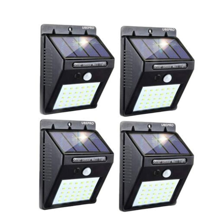 Set 4 lampi solare de perete cu senzor de miscare si lumina, 30 LED-uri, Negru.