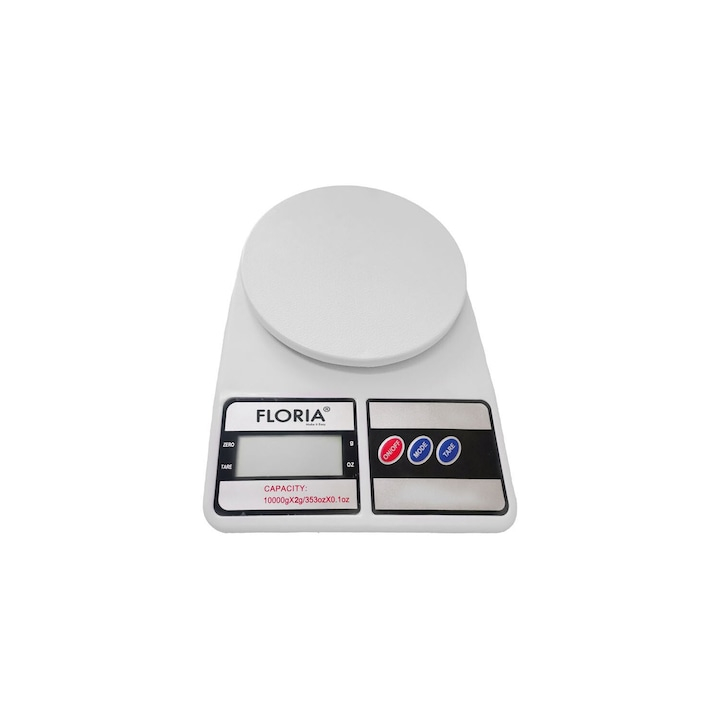 Cantarul de bucatarie Floria ZLN9075 are o capacitate de maxim 10000g (10kg) si are o acuratete de 2g-10000g. Acesta este capabil sa cantareasca in unitatile de masura: G, Oz, acestea pot fi alese si schimbate prin apasarea butonului "UNIT" de pe panoul cantarului.