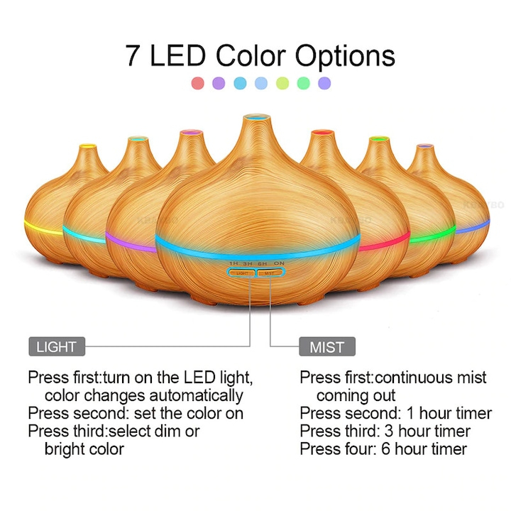 Umidificator si difuzor aromaterapie cu ultrasunete, cu telecomanda, lemn natur,7 culori programabil, oprire automata